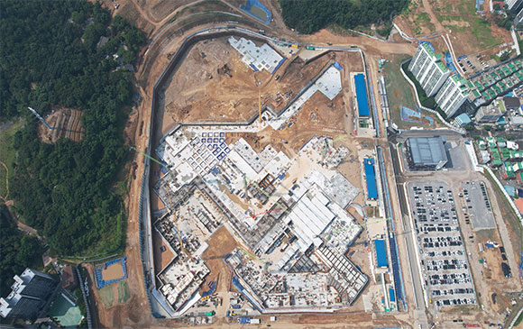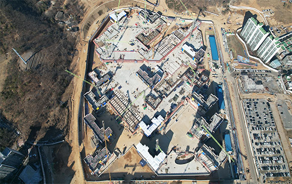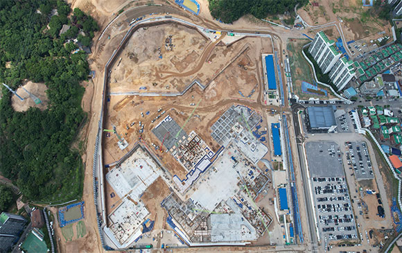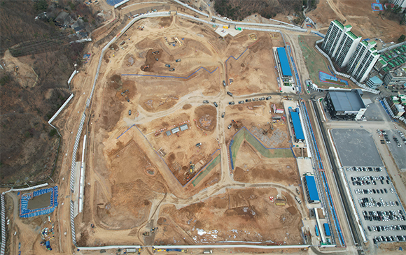 ▶ 외곽부 흙막이 및 발파공사 진행 중 (어스앙카 및 띠장)